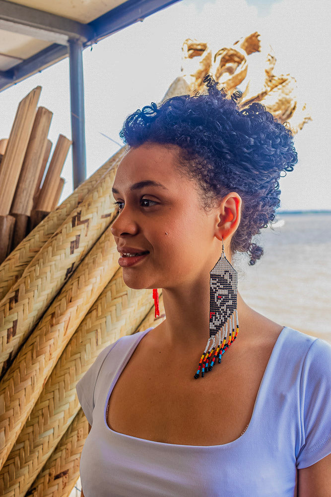 Este brinco destaca a beleza dos grafismos tradicionais Hixkaryana em um elegante contraste de preto e branco. Cada padrão tecido com miçangas conta uma história e representa a identidade de um povo. As franjas coloridas quebram a sobriedade com um toque de alegria, simbolizando a riqueza cultural e a resiliência. Uma peça sofisticada e cheia de significado, feita à mão para celebrar a arte indígena milenar.