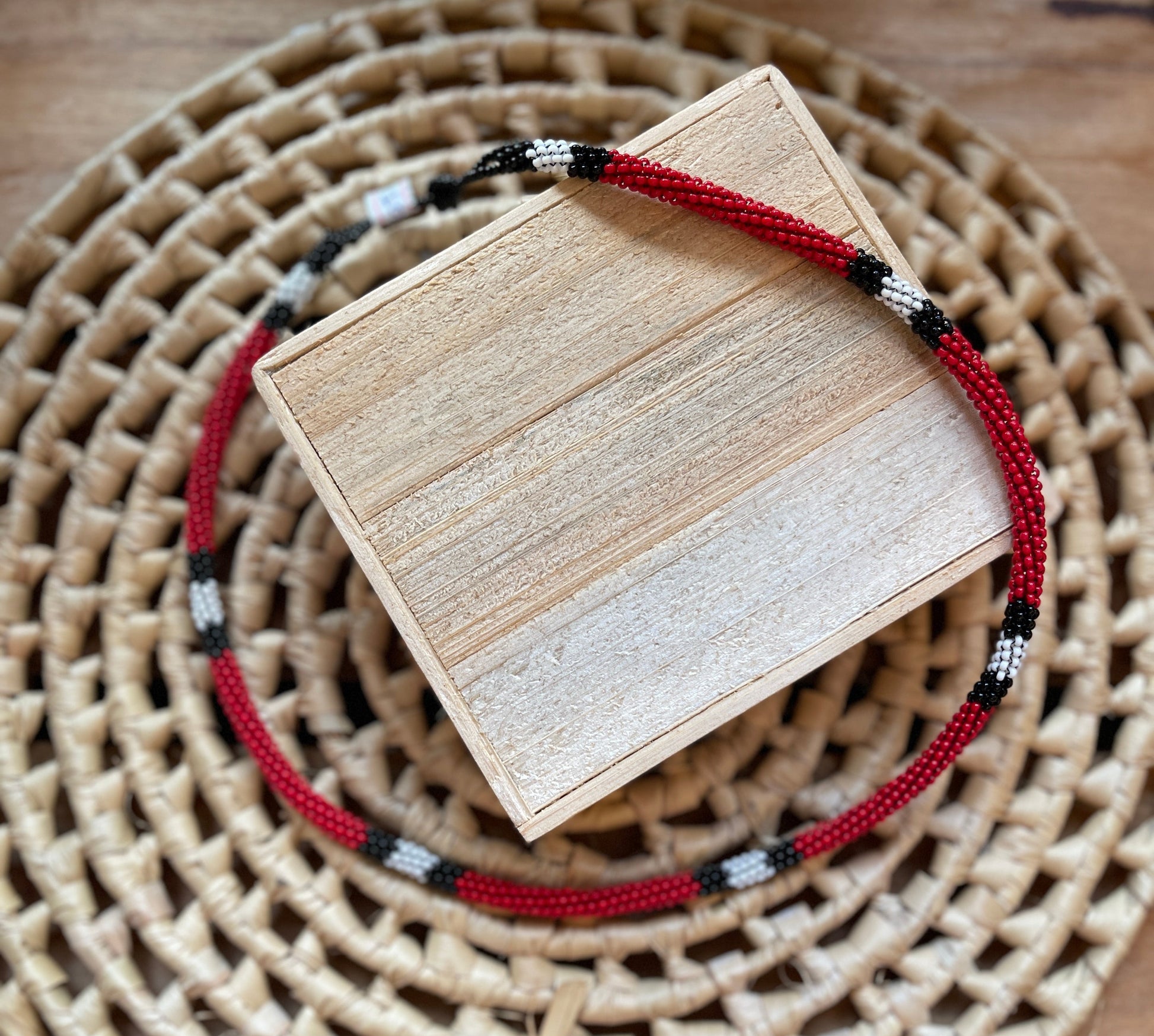Vibrante e poderoso, este colar em tons de vermelho, preto e branco pulsa com a energia da terra. O vermelho, cor de forte simbolismo, representa a vida, a coragem e a luta. Uma peça artesanal que é um amuleto de força e identidade.